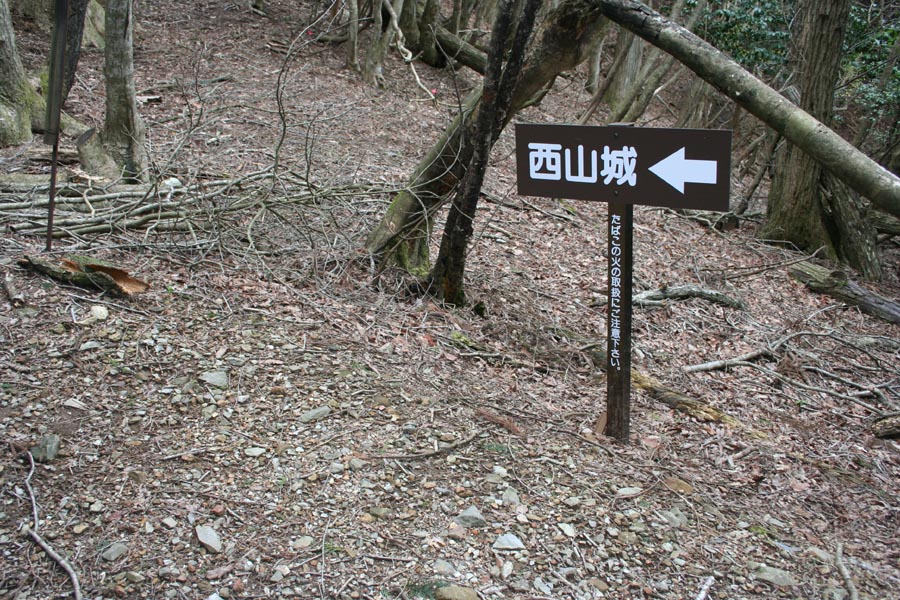 西山城は朽木氏が戦国時代詰めの城として築いた山城である。西方の若狭街道、東方の朽木街道を扼する標高356メートルの西山山上に築かれた要害だ。その規模は南北450メートルの山上に十ヶ所以上の曲輪を築き、堀切・土塁がもうけられ、大手方面には虎口ももうけられている。本丸北方の烽火台など、小規模ながら高い技術で築かれた城だ。
