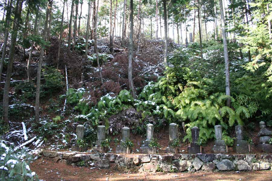 城址南方の金輪寺・金輪寺から城址へ・最初の曲輪・古い墓所から曲輪を見上げる