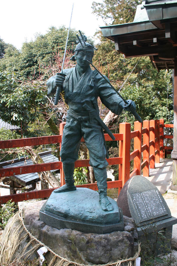 いまより約七百年前の永仁二年(194)に勧請されたという。祭神は祇園八坂神社と同じ素盞鳴命・ 稲田姫命、そして八王子命(五王子・三王女)である。 古来より北天王(北の祇園)と称され、皇居守護神十二社中の一社にして、都の東北隅表鬼門に 位置し、方除、厄除、縁結び、学業の神として厚く信仰された。 後水尾天皇、霊元天皇、光格天皇の修学院離宮行幸のみぎりには、 白銀などが奉納されたと伝えられる。 八大神社を有名にしたのは、宮本武蔵が吉岡一門と戦った一乗下り松の決闘である。 史実はともかくとして、吉川英治が小説「宮本武蔵」の中で、武蔵が決闘の前に 八大神社に立ち寄ったと記されてからだ。それによれば、八大神社の神に祈ろうとした武蔵は寸前で 考え直し決闘に望んだことになっている。いま、社殿のとなりに決闘当時のものという下り松の古木が保存され、 すぐ近くにブロンズ製の武蔵像が建立されている。 また、徳川家康の部将だった石川丈山が隠遁生活をおくった詩仙堂丈山寺がすぐ近くにある。 [境内案内板の由緒書 など] |