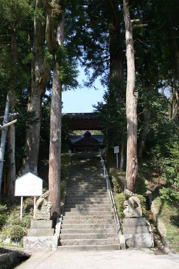 | 参道の石段 ・ 拝殿 ・ 拝殿に彫られた神紋 ・ 社殿を見る ) |