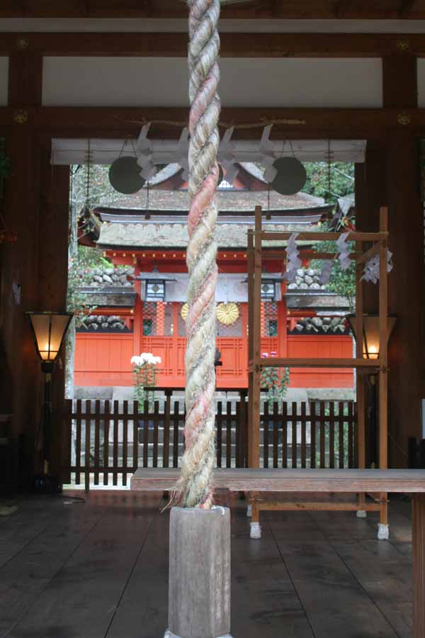 ●大鳥居に飾られた祭礼の御幣 ●見事な朱の鳥居 ●祭礼の準備に忙しい拝殿 ●神紋の面高 ●国宝の本殿