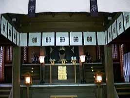 灯篭祭りで知られる山鹿市にある。景行天皇の本営跡といわれ、同天皇を祀っている。濃霧の日においでになった景行天皇を村人が松明を灯してお迎えしたことが、灯篭祭りの始まりと伝えている。神紋は菊池氏と同じ「並び鷹の羽」に細輪が付けられていた。 ●山鹿神社内陣/●山鹿灯篭を模した灯篭/●山鹿神社の神紋 |