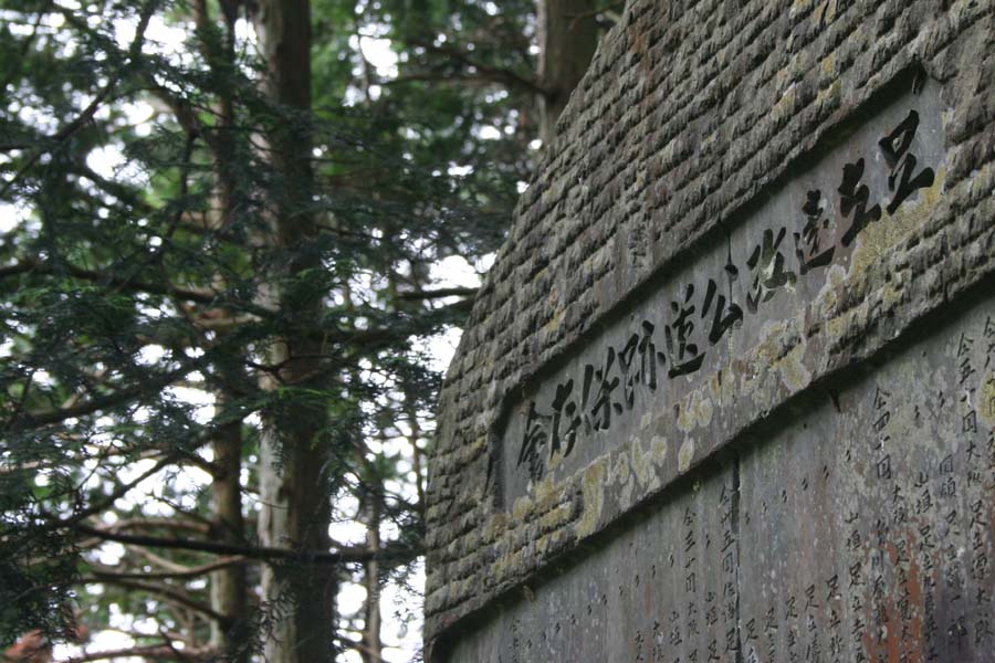 遠政の墓域を囲む玉垣の石扉には「酢漿草紋」と「五本骨扇紋」が刻まれ、江戸時代の墓石もみえる